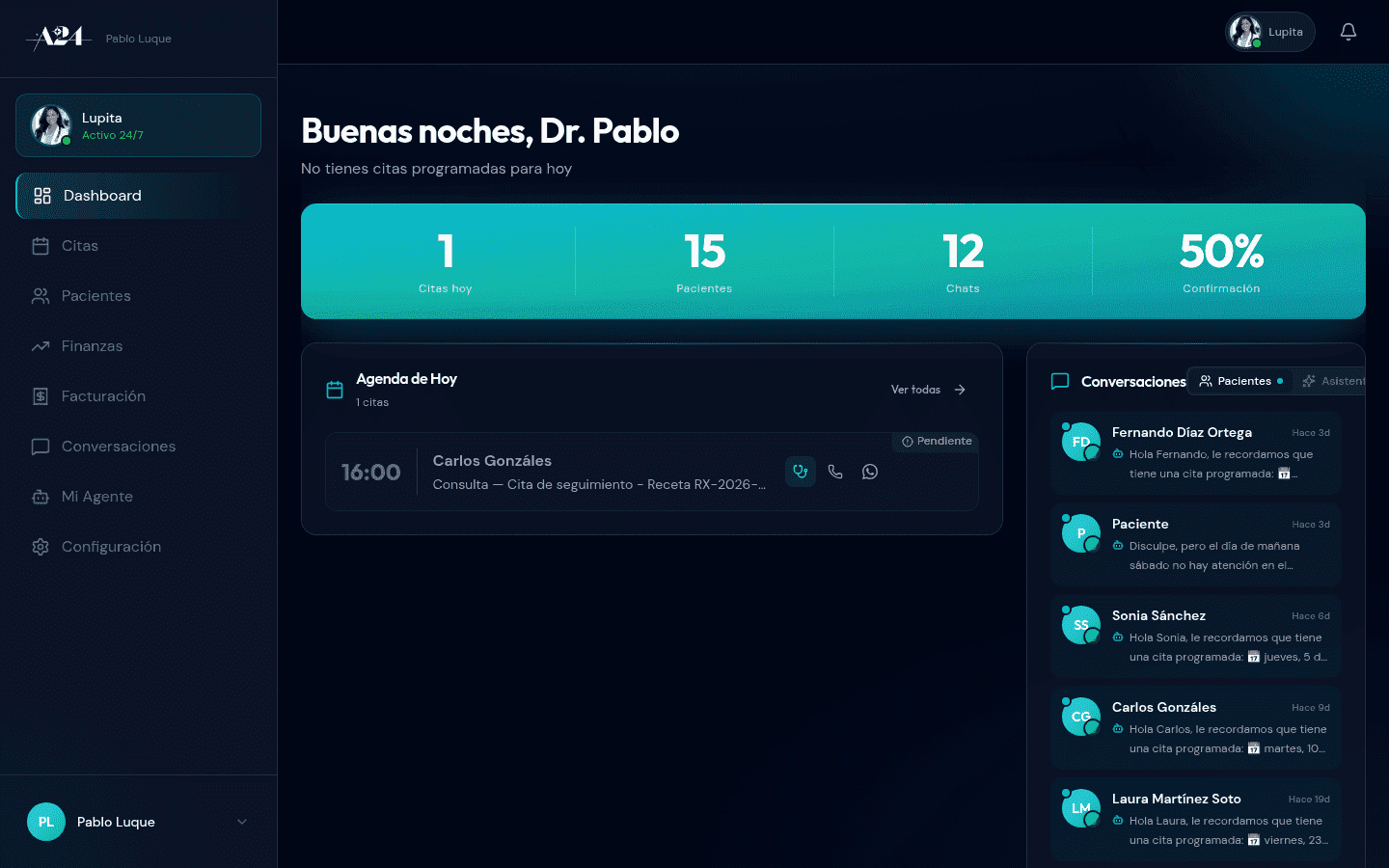 Con Agentes24, tus pacientes reciben atención inmediata a cualquier hora. El agente de IA confirma citas, responde dudas y agenda consultas — incluso mientras tú duermes.